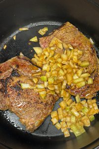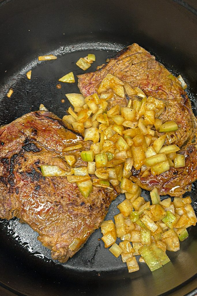 Heat a cast-iron or stainless-steel pan over high heat for 1-2 minutes. Shake off excess marinade and place the ribeye in the hot pan. Sear for 2-3 minutes per side for medium-rare (130-135°F / 54-57°C) or 3-4 minutes per side for medium (135-140°F / 57-60°C). Add the marinated diced onions to the pan in the last minute of cooking to soften and caramelize. Rest the steak for 5-10 minutes, then chop into small cubes.